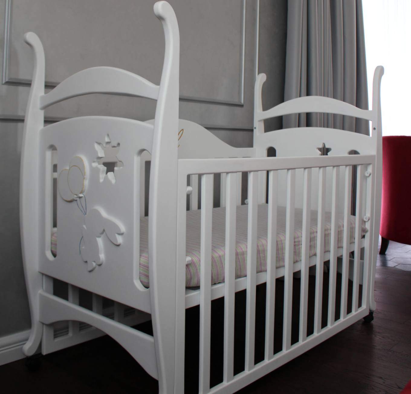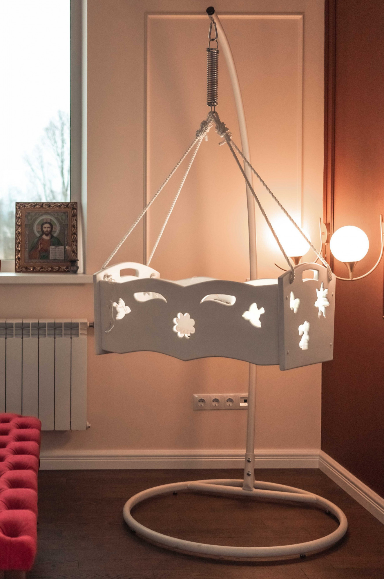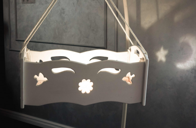 Колыбель выполнена в белом цвете. Цвет чистоты, нежности. Цвет, который впишется практически в любой интерьер. Нежные изгибы, контуры цветка и птичек, все это будет усиливать родительскую любовь, которая станет главным оберегом счастливого дитя.