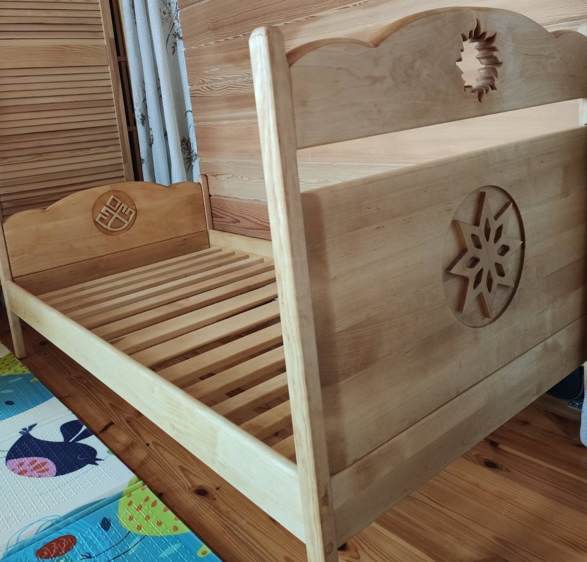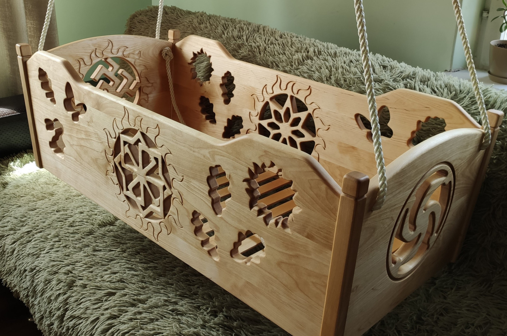 Колыбель собрана на клей без металлических элементов. Украшена славянскими оберегами "Символ Рода", "Ратиборец", "Звезда Руси", а также изображением волка. Это колыбель для настоящих богатырей, защитников рода.
